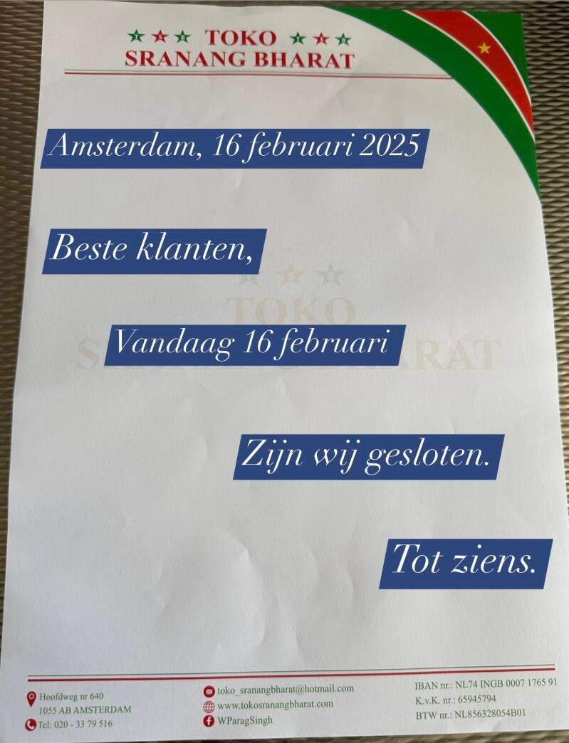 Beste klanten Toko Sranang Bharat sluit vandaag om 19:00 uur i.p.v. 18:00 uur.