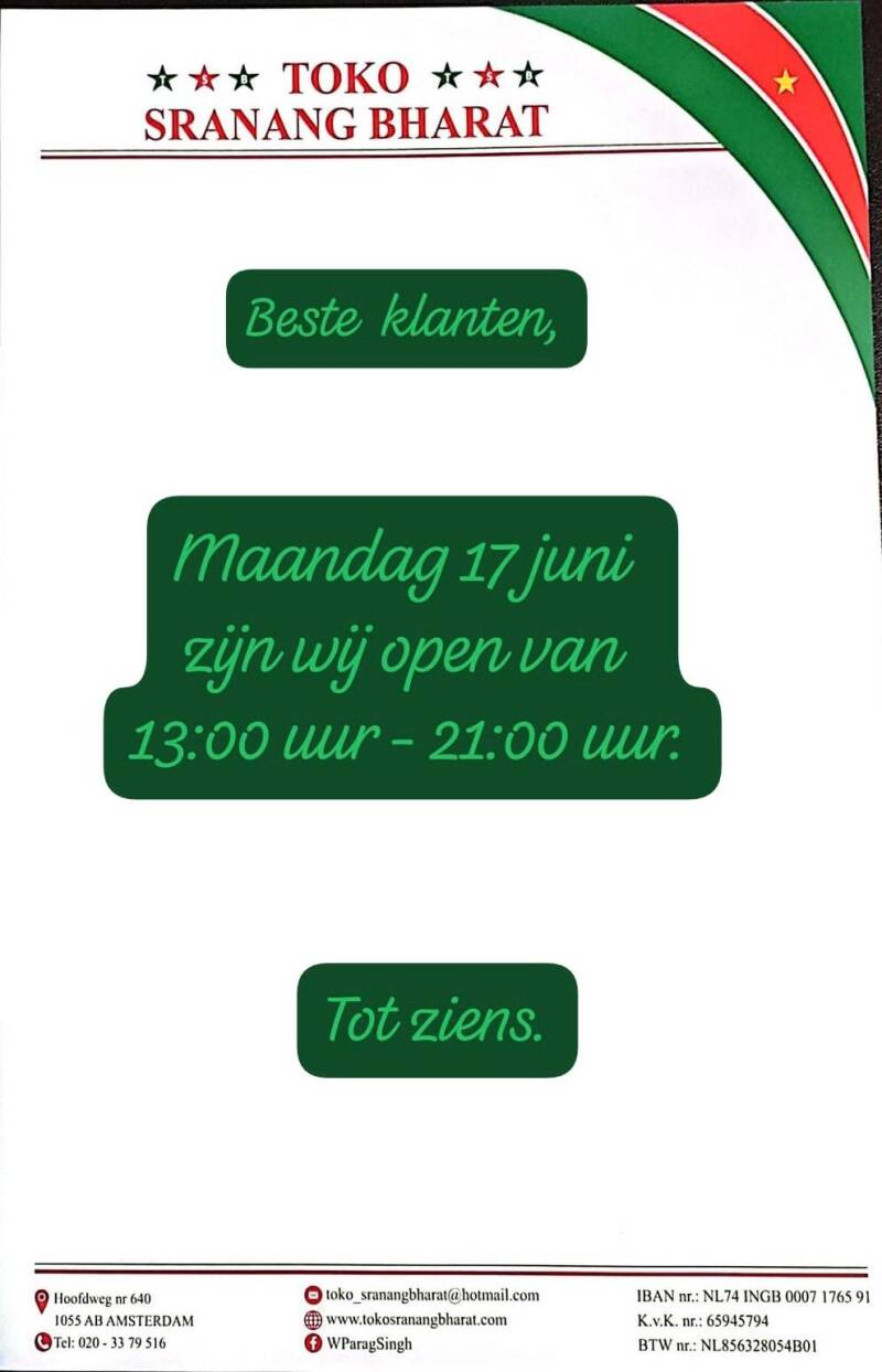 Beste klanten Toko Sranang Bharat is vandaag van 10:15 - 19:00 uur open.