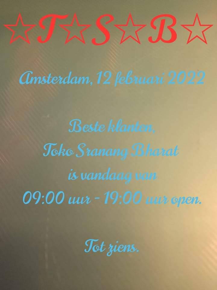 Beste klanten Toko Sranang Bharat is vandaag van 10:30 -19:00 uur open.